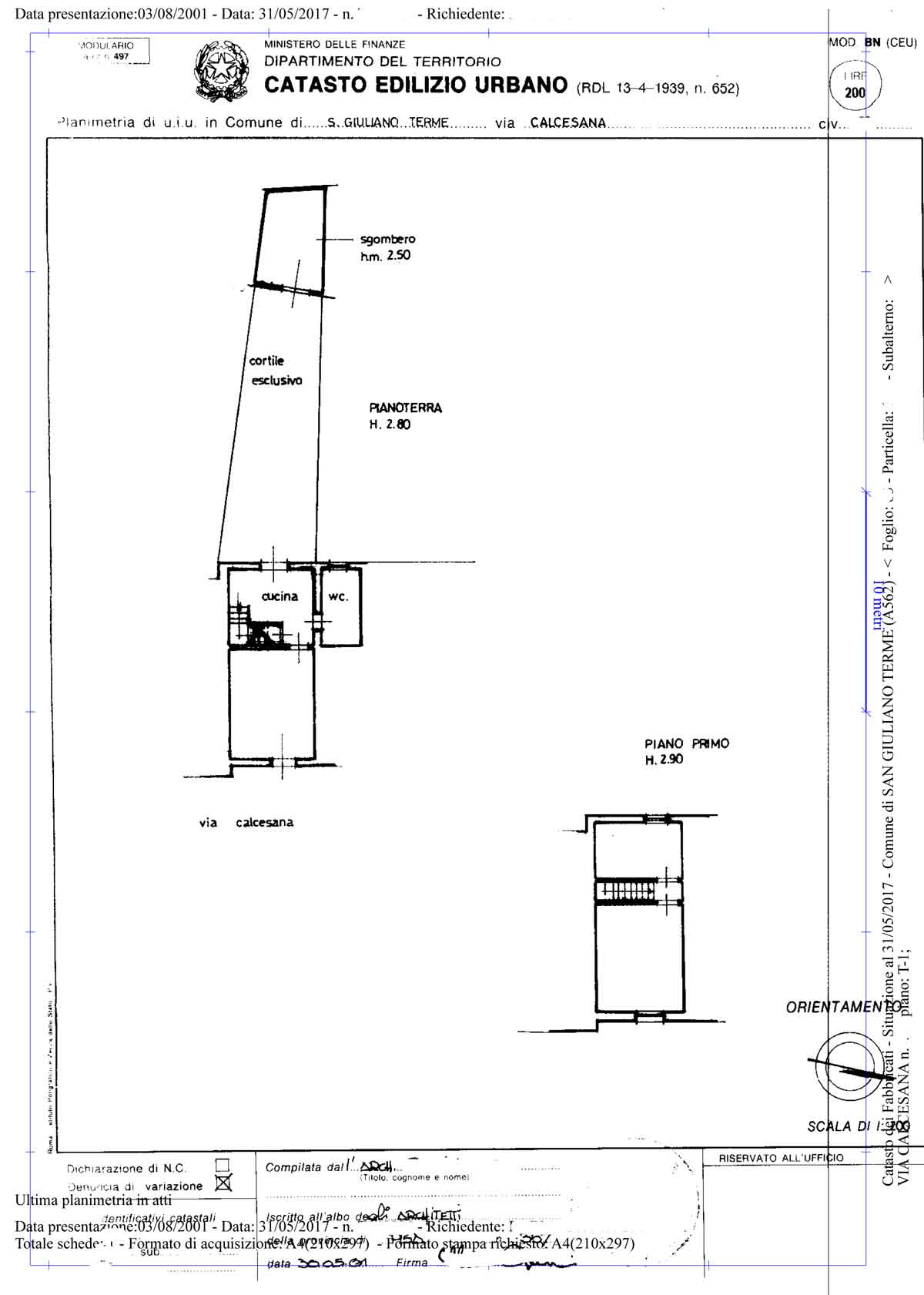 1) Al piano terra abbiamo l’ingresso dalla strada sul soggiorno di 16 mq, il disimpegno con ripostiglio sottoscala, il bagno con doccia e finestra, e la cucina/pranzo con accesso al resede di proprietà sul retro; Al piano primo, accessibile dalla scala in cucina, abbiamo le due grandi camere matrimoniali e un secondo ripostiglio.