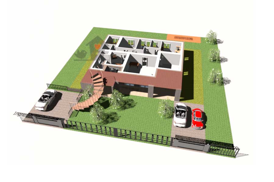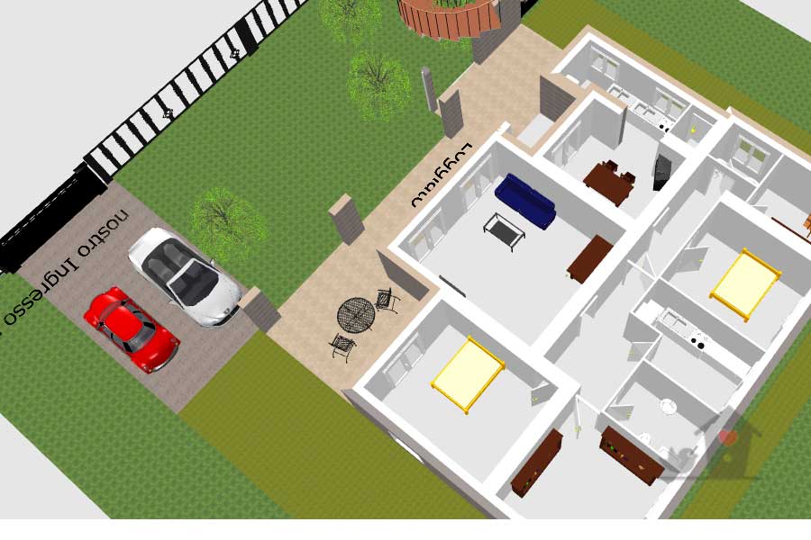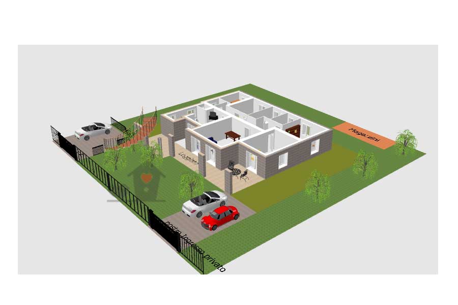 1) La villa di 180 mq lordi è al piano terra di un contesto trifamiliare. Significa che si accede alla villa con accesso carrabile privato dal giardino di oltre 900 metri quadrati di proprietà ed uso esclusivo che circonda la villa e tramite scala di passo indipendente da altro cancello, si accede ai due appartamenti sopra di essa.