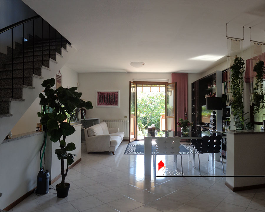 PIANO TERRA: ampio salone e sala pranzo di 35 mq con vista ed accesso al giardino retro, terrazza, cucina abitabile di 11 mq con terrazzo ed accesso al giardino fronte, antibagno con armadio a muro e bagno di 6 mq con finestra;